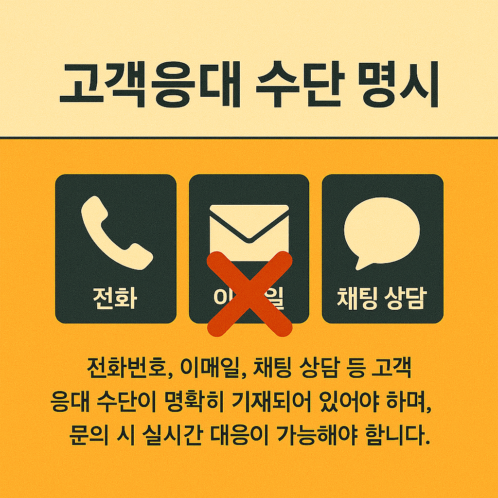 전화번호, 이메일, 채팅 상담 등의 고객응대 수단이 명확히 기재되어 있어야 하며, 문의 시 실시간 대응이 가능한지도 체크하세요.
