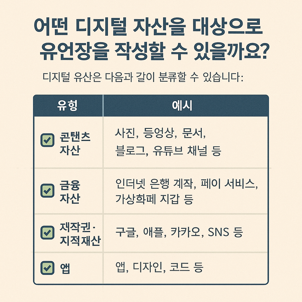 디지털 유언장은 **디지털 자산(계정, 콘텐츠, 가상화폐, 사진 등)**을 대상으로 유산 분배 의사를 표시하는 데 적합합니다.