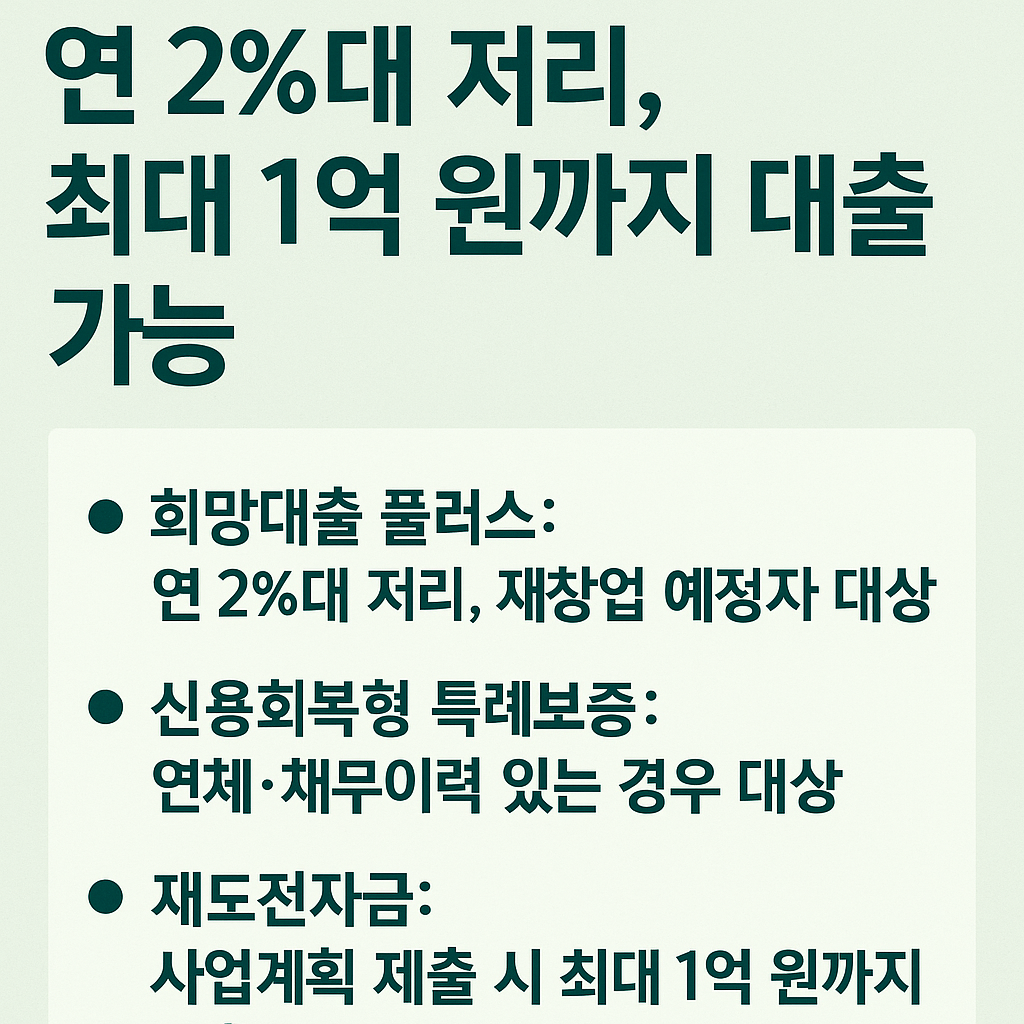 • 희망대출 플러스: 연 2%대 저리, 재창업 예정자 대상