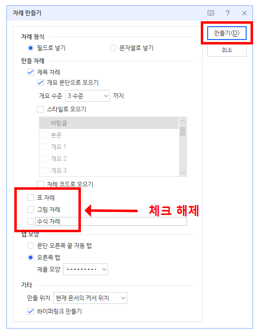 3. 불필요한 옵션(표 차례, 그림 차례, 수식 차례 등)은 체크 해제